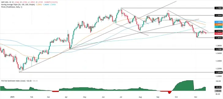انخفض زوج استرليني/دولار GBP/USD بشكل طفيف يوم الأربعاء حيث تراجع التضخم في المملكة المتحدة في أكتوبر، مما زاد من فرصة خفض سعر الفائدة من قبل بنك إنجلترا (BoE) في ديسمبر. في وقت كتابة هذا التقرير، يتداول الزوج عند 1.3120 بعد أن وصل إلى ذروته عند 1.3155.