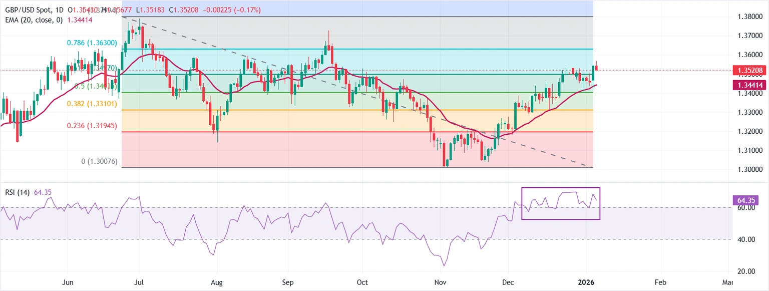 يعيد الجنيه الإسترليني (GBP) خسائره المبكرة مقابل الدولار الأمريكي (USD) وينخفض إلى قرب 1.3520 خلال جلسة التداول الأوروبية يوم الثلاثاء. يتراجع زوج استرليني/دولار GBP/USD مع تعافي الدولار الأمريكي من خسائره المبكرة. اقرأ المزيد...