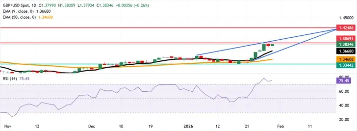 استعاد زوج استرليني/دولار GBP/USD خسائره الأخيرة من الجلسة السابقة، متداولًا حول 1.3830 خلال الساعات الآسيوية يوم الخميس. يشير التحليل الفني للرسم البياني اليومي إلى احتمال حدوث انعكاس هبوطي حيث يضيق النطاق، مما يدل على تراجع زخم المشترين ضمن نمط وتد صاعد.