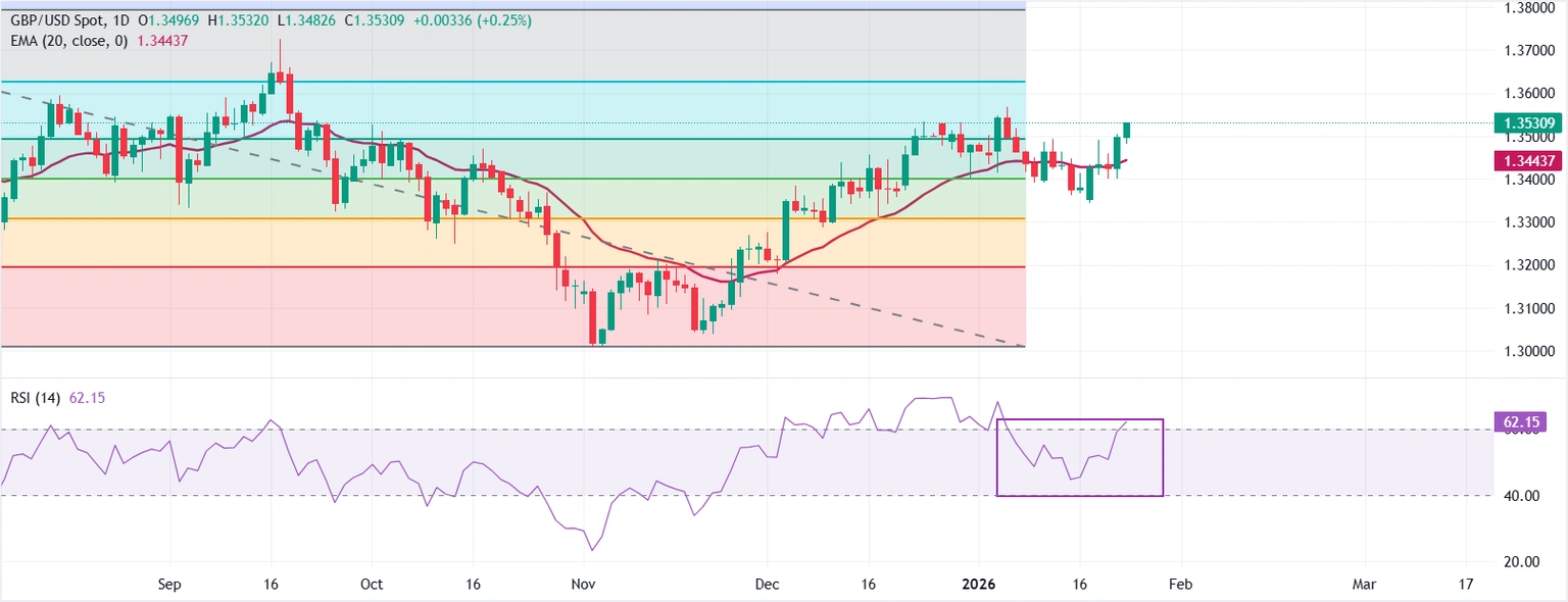 زوج استرليني/دولار GBP/USD يقفز فوق 1.3540 مع مفاجأة مبيعات التجزئة ومؤشرات مديري المشتريات البريطانية بالارتفاع