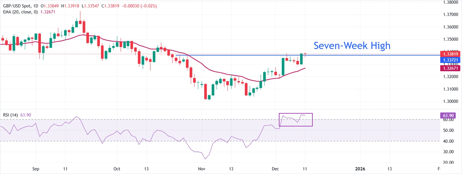 يتداول زوج استرليني/دولار GBP/USD في المنطقة السلبية بالقرب من 1.3365 خلال ساعات التداول الأوروبية المبكرة يوم الخميس، تحت ضغط انتعاش الدولار الأمريكي (USD). ومع ذلك، قد تكون المخاطر السلبية محدودة بعد أن قدم الاحتياطي الفيدرالي الأمريكي (Fed) خفضًا لسعر الفائدة في اجتماعه للسياسة في ديسمبر. يستعد المتداولون لتقرير مطالبات البطالة الأولية الأسبوعية الأمريكية، الذي سيتم نشره لاحقًا يوم الخميس. اقرأ المزيد...