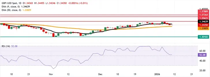 يظل زوج استرليني/دولار GBP/USD هادئاً لليوم الرابع على التوالي، متداولًا حول منطقة 1.3430 خلال ساعات التداول الآسيوية يوم الجمعة. مؤشر القوة النسبية RSI بإعدادات 14 يومًا للزخم عند مستويات 51.9 يقدم موقف محايد، مما يعكس زخمًا أبطأ بعد القراءات القوية الأخيرة. انخفاض مؤشر القوة النسبية RSI مرة أخرى فيما دون مستويات 50 سوف يعزز حجة تسجيل تراجع أعمق.