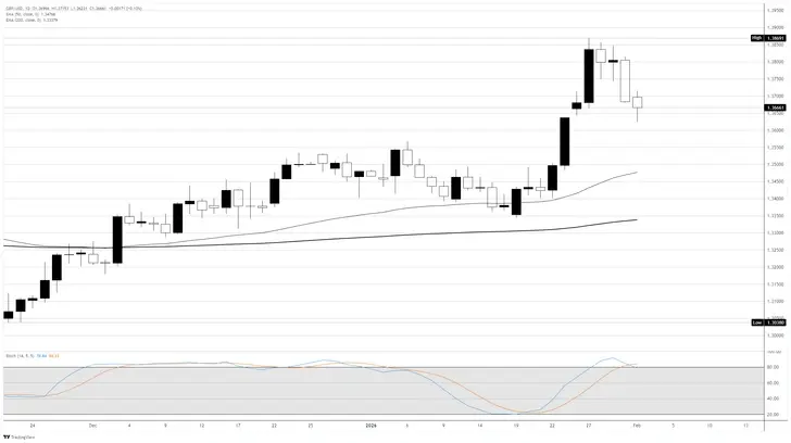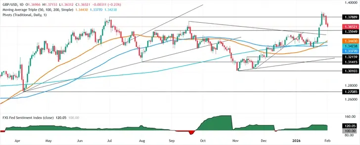 تراجع الجنيه الاسترليني GBP خطوة أخرى نحو الاتجاه الهابط وسط موقف حذر في مقابل الدولار الأمريكي USD يوم الاثنين، متراجعًا مرة أخرى من أعلى مستوياته الأخيرة خلال عدة سنوات، حيث قام المستثمرون بتكوين مراكزهم تحسباً لأسبوع مزدحم يتضمن بيانات بريطانية وقرار السياسة النقدية الأول من جانب بنك انجلترا BoE في عام 2026. انخفض زوج استرليني/دولار GBP/USD إلى منطقة 1.3646، متراجعًا من أعلى مستويات أغسطس/آب 2021 عند منطقة 1.3847 المسجلة في 27 يناير/كانون الثاني، حيث ضغط الدولار الأقوى وتكوين مراكز التداول قبل صدور قرار بنك انجلترا BoE على انخفض زوج استرليني/دولار GBP/USD.