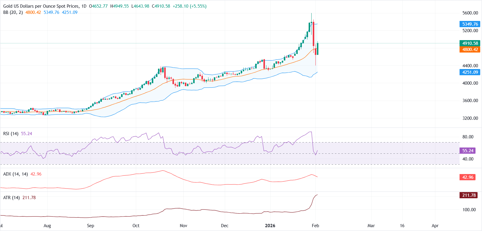 من منظور تقني، لا يزال الاتجاه الصعودي العام على الرسم البياني اليومي قائمًا. يحتفظ السعر بمستوى فوق المتوسط المتحرك البسيط لمدة 20 يومًا، والذي يمثل أيضًا النطاق الأوسط لبولينجر، بالقرب من 4800 دولار، مما يحافظ على هيكل الاتجاه قصير الأجل بشكل إيجابي على الرغم من التصحيح الحاد والمتقلب من ذروة الأسبوع الماضي.