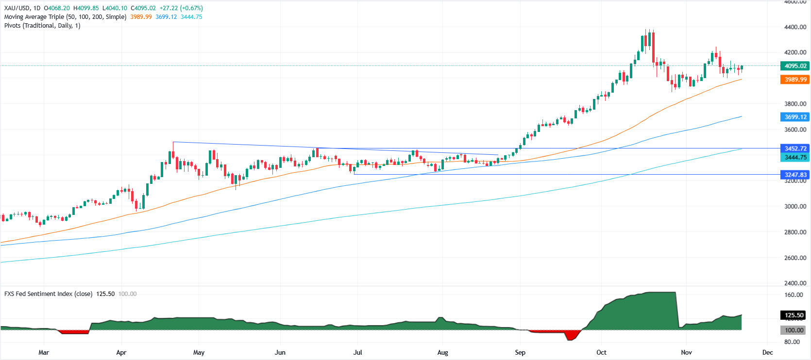 يستمر الأداء المتقلب لأسعار الذهب دون الحاجز السعري 4100 دولار. يتداول الدولار الأمريكي في وضع دفاعي وسط آمال خفض سعر الفائدة من قبل الاحتياطي الفيدرالي. تدعم الرهانات المتزايدة على مزيد من التيسير النقدي من قبل الاحتياطي الفيدرالي ارتفاع المعدن.