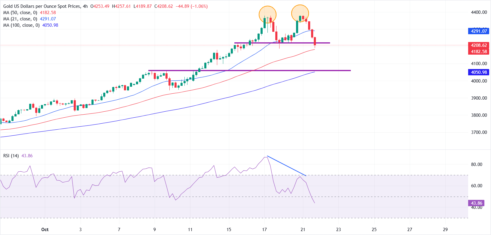 - الإعداد الفني يظهر قمة مزدوجة محتملة على الرسم البياني إطار 4 ساعات، مما يشير إلى وجود مجال لتصحيح أعمق دون 4200 دولار.