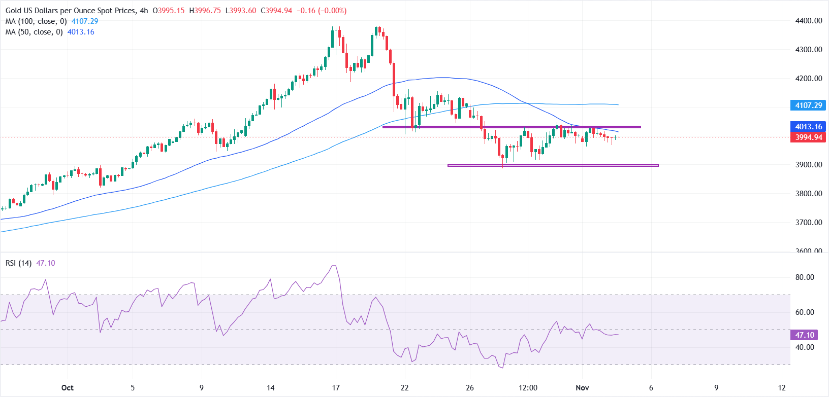 على الجانب الهبوطي، يقع الدعم الأول عند أدنى مستوى خلال اليوم عند 3966 دولار، يليه المستوى النفسي 3900 دولار. يقف مؤشر القوة النسبية (RSI) على الرسم البياني لفترة 4 ساعات بالقرب من 47، مما يشير إلى تحيز محايد ويعزز وجهة نظر التماسك ضمن النطاق الحالي.