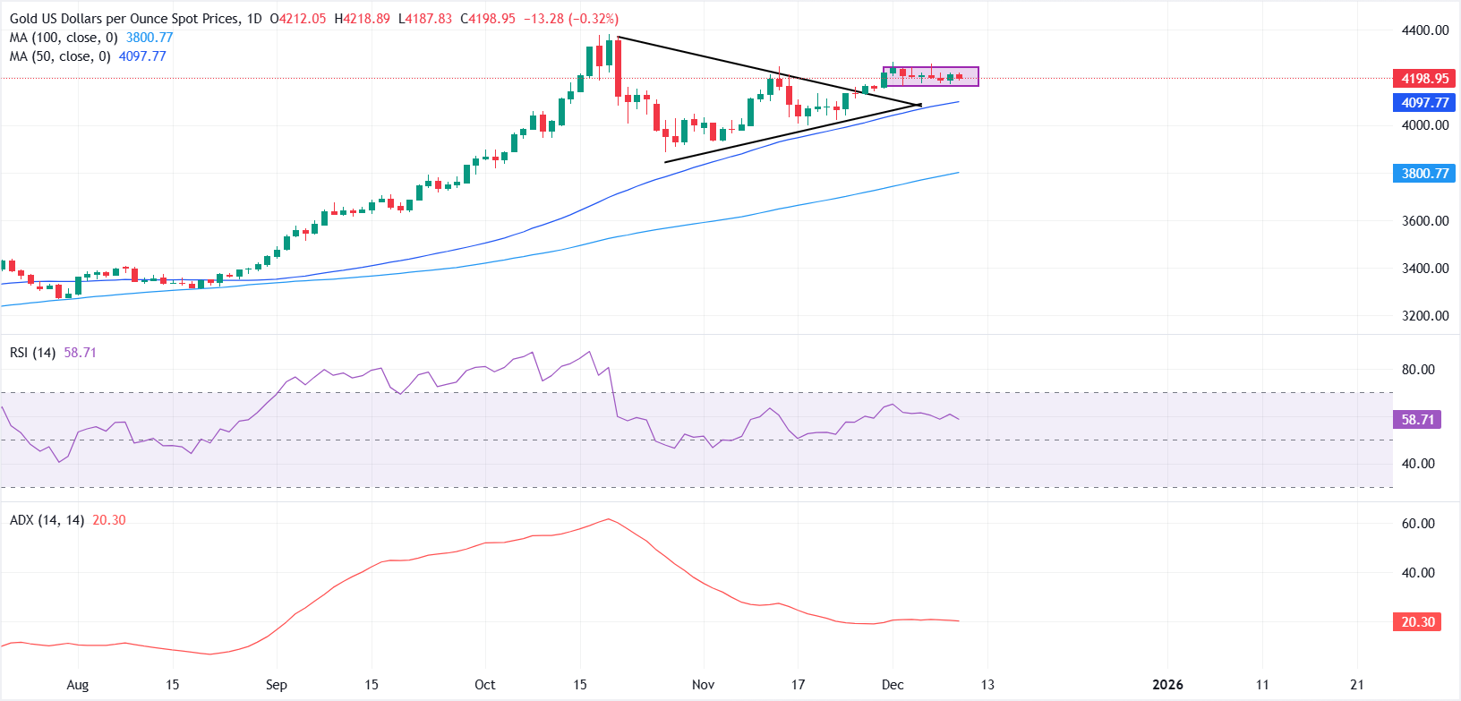 - تظل الإعدادات الفنية بناءة، حيث يحتفظ XAU/USD بمستويات فوق المتوسطات المتحركة الرئيسية ويتماسك ضمن نطاق 4,150–4,250 دولار.