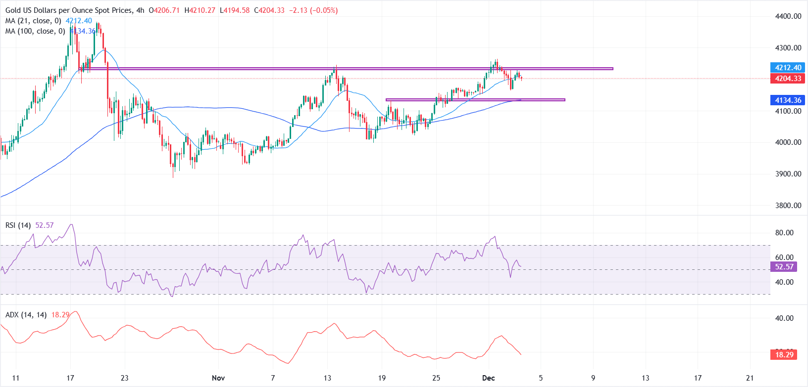 في الرسم البياني لفترة 4 ساعات، يرتفع المتوسط المتحرك البسيط 21 فترة فوق المتوسط المتحرك البسيط 100 فترة، مما يحافظ على هيكل صعودي أوسع. السعر يجلس تحت المتوسط المتحرك البسيط 21 عند 4212.44 دولار بينما يبقى فوق المتوسط المتحرك البسيط 100 عند 4134.37 دولار، مما يحافظ على النغمة على المدى القريب متباينة. مؤشر القوة النسبية (RSI) لمدة 14 فترة يقف عند 52.84، محايد، بعد أن تبرد من منطقة التشبع الشرائي.