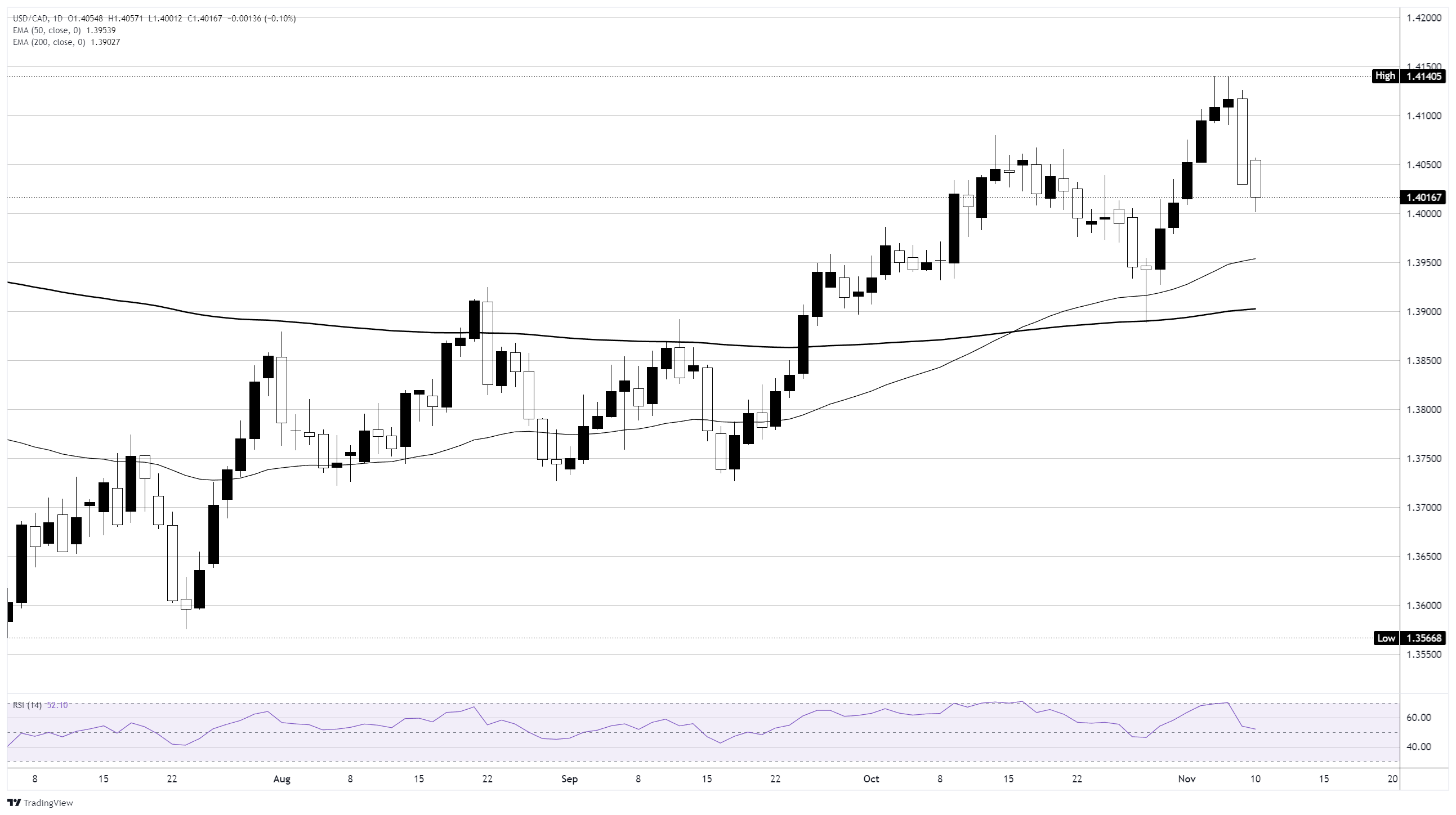 يستمر زوج دولار أمريكي/دولار كندي USD/CAD في التداول ضمن اتجاه صعودي، على الرغم من أن حركة الأسعار الأخيرة تشير إلى أن تراجعًا قصير الأجل جارٍ بينما يستعيد الدولار الكندي الأرض المفقودة. بعد أن وصل إلى قمة حديثة بالقرب من 1.4140، فشل المشترون في تمديد الارتفاع، مما أدى إلى تراجع لمدة يومين يختبر الآن منطقة 1.4010–1.4000.