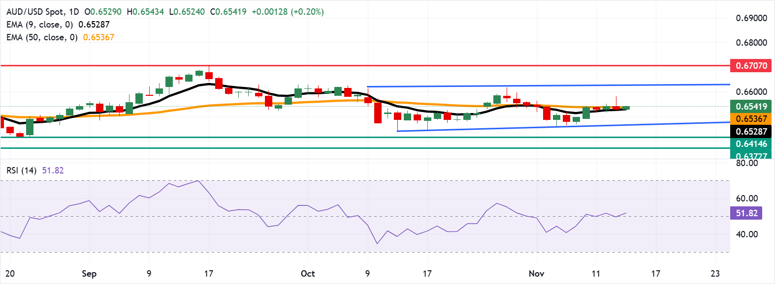 يتداول زوج AUD/USD حول 0.6540 يوم الجمعة. على الرسم البياني اليومي، يبدو أن الزوج يتماسك ضمن نطاق مستطيل، مما يعكس حركة جانبية. ومع ذلك، يبقى فوق المتوسط المتحرك الأسي لمدة تسعة أيام، مما يشير إلى زخم صعودي قوي على المدى القصير.