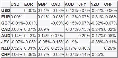 يوضح الجدول أدناه النسبة المئوية للتغير في الدولار الأمريكي USD في مقابل العملات الرئيسية المدرجة اليوم. كان الدولار الأمريكي هو الأضعف في مقابل الدولار النيوزيلندي.
