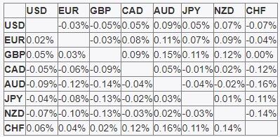 تُظهر الخريطة الحرارية التغيرات المئوية للعملات الرئيسية في مقابل بعضها البعض. يتم اختيار العملة الأساسية من العمود الأيسر، بينما يتم اختيار عملة التسعير من الصف العلوي. على سبيل المثال، إذا اخترت اليورو من العمود الأيسر وتحركت على طول الخط الأفقي إلى الين الياباني، فإن النسبة المئوية للتغير المعروض في المربع سوف تمثل زوج يورو EUR (الأساس) / ين JPY (التسعير).