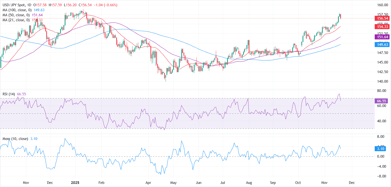 ومع ذلك، تظل هيكل الاتجاه الأوسع إيجابيًا. يستمر الزوج في التداول بشكل مريح فوق المتوسطات المتحركة الرئيسية، مع المتوسط المتحرك البسيط لمدة 21 يومًا (SMA) بالقرب من 154.30 الذي يوفر أول طبقة من الدعم الديناميكي، يليه المتوسط المتحرك البسيط لمدة 50 يومًا حول 151.60. طالما أن هذه المناطق ثابتة، من المحتمل أن تجذب الانخفاضات اهتمامًا جديدًا بالشراء.