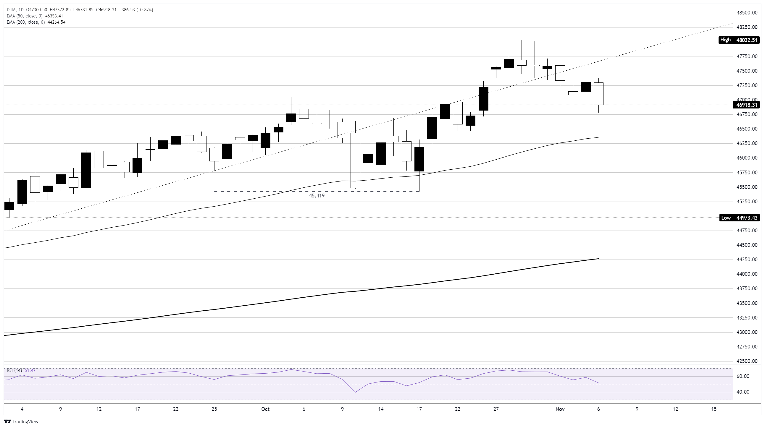 اختبر مؤشر داو جونز العودة إلى ما دون مستوى 47000، منخفضًا حوالي %2.6 من القمة إلى القاع بعد تسجيله أعلى مستويات قياسية فوق 48000 في نهاية أكتوبر. يحصل الانخفاض العام في أسهم التكنولوجيا على نظرة جديدة يوم الخميس بعد عمليات بيع أولية وانتعاش قصير خلال منتصف الأسبوع. جميع أسهم Salesforce (CRM) وNvidia (NVDA) وMicrosoft (MSFT) في المنطقة الحمراء لهذا اليوم حيث بدأ المستثمرون في إلقاء نظرة فاحصة على ما إذا كانت التقييمات المرتفعة للغاية ونسب السعر إلى الأرباح المستقبلية المقاسة بالقرون لموردي تكنولوجيا مراكز البيانات يمكن أن تستمر في تبريرها في مواجهة توليد الإيرادات الأسطورية من مشاريع الذكاء الاصطناعي.