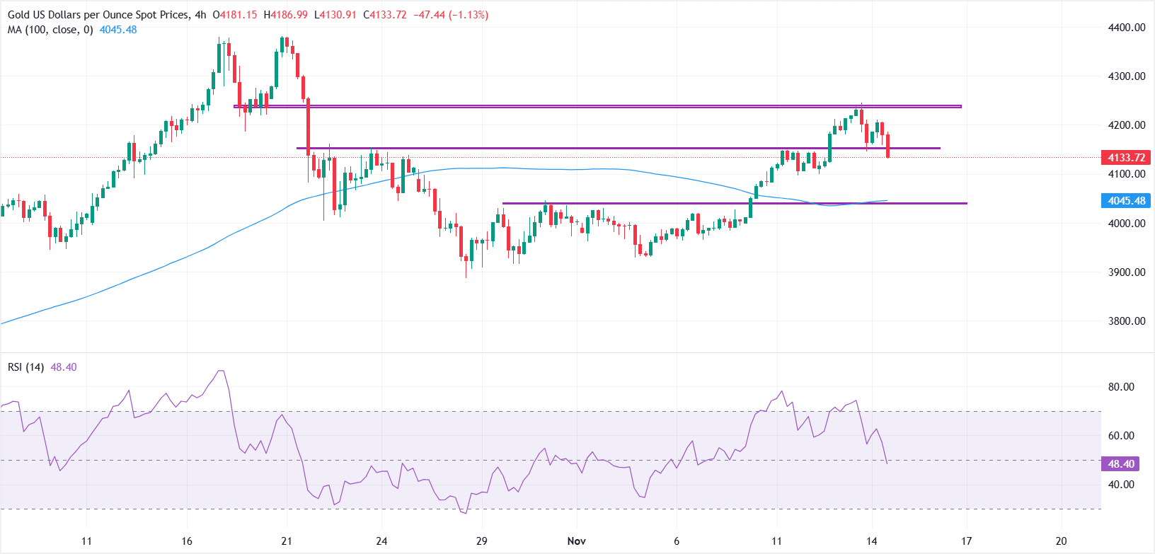 خفف الارتياح بشأن انتهاء الإغلاق الحكومي الأمريكي من بعض جاذبية الذهب كملاذ آمن. في الوقت نفسه، أدت سلسلة من التصريحات الحذرة من مسؤولي الاحتياطي الفيدرالي إلى دفع المتداولين لتقليل توقعاتهم بشأن خفض سعر الفائدة في ديسمبر/كانون الأول. إن تلاشي احتمال التيسير على المدى القريب يساعد الدولار الأمريكي (USD) على التعافي بعد الضعف الأخير، مما يزيد الضغط على المعدن الذي لا يقدم عائدًا.