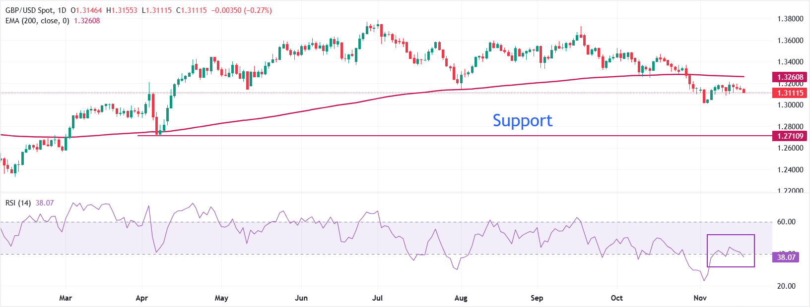 تراجع الجنيه الإسترليني إلى قرب 1.3100 مقابل الدولار الأمريكي يوم الأربعاء. الاتجاه العام لزوج GBP/USD لا يزال هبوطيًا حيث يتم تداوله دون المتوسط المتحرك الأسي (EMA) لمدة 200 يوم، والذي يقع حول 1.3264.