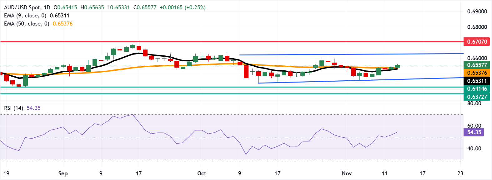 يتداول زوج AUD/USD حول 0.6560 يوم الخميس. على الرسم البياني اليومي، يبدو أن الزوج يتماسك ضمن نطاق مستطيل، مما يعكس حركة جانبية. ومع ذلك، لا يزال فوق المتوسط المتحرك الأسي لمدة تسعة أيام (EMA)، مما يشير إلى زخم صعودي قوي على المدى القصير.