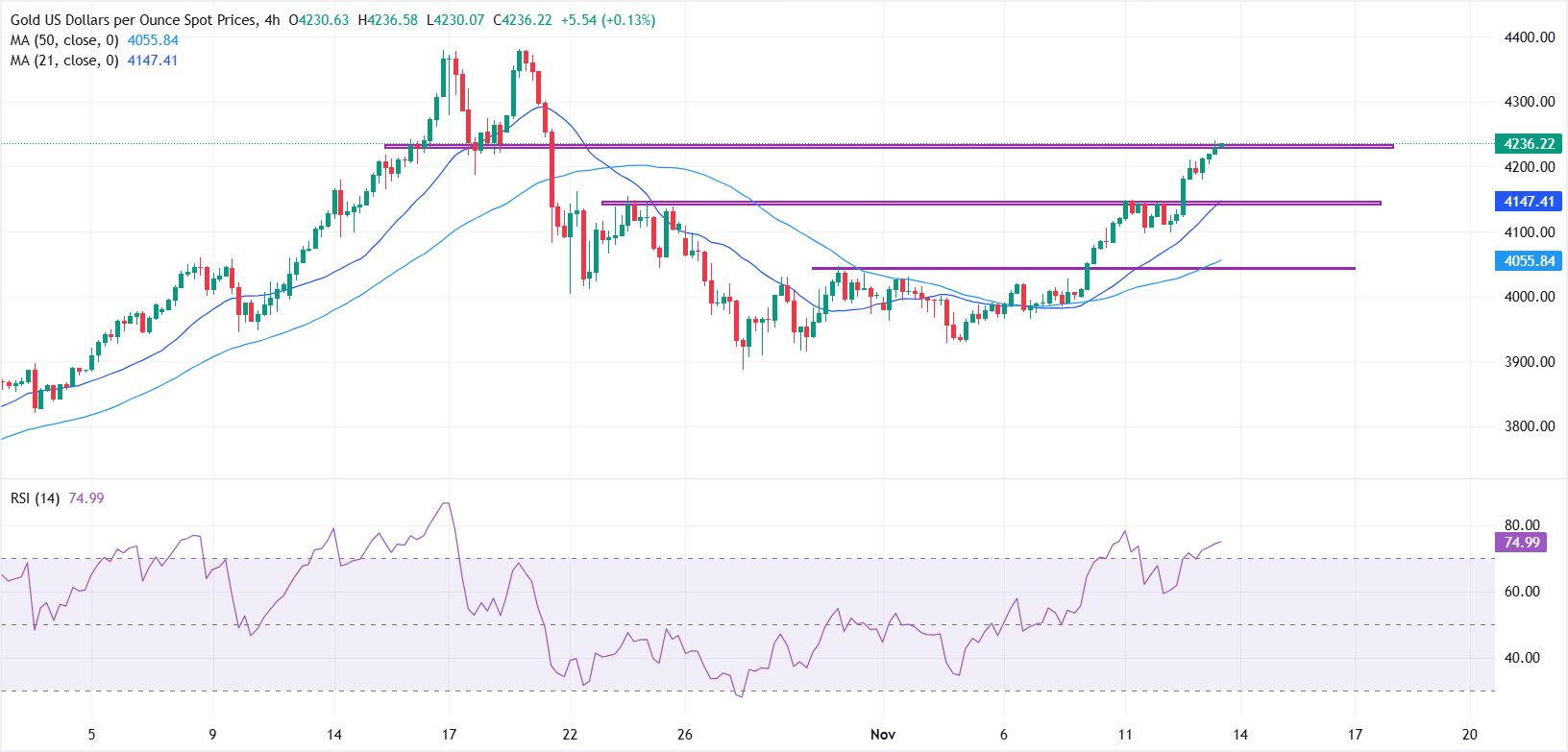 استأنف زوج XAU/USD اتجاهه الصاعد السائد على الرسم البياني لمدة 4 ساعات بعد مرحلة توطيد صحية وتراجع تصحيحي قصير. الآن، يختبر المعدن منطقة مقاومة رئيسية عند 4230-4250 دولار، والتي تمثل منطقة الانهيار السابقة. سيفتح الاختراق الحاسم فوق هذه المنطقة الباب لإعادة اختبار أعلى مستوى على الإطلاق بالقرب من 4381 دولار وقد يدخل منطقة قياسية جديدة بعده.