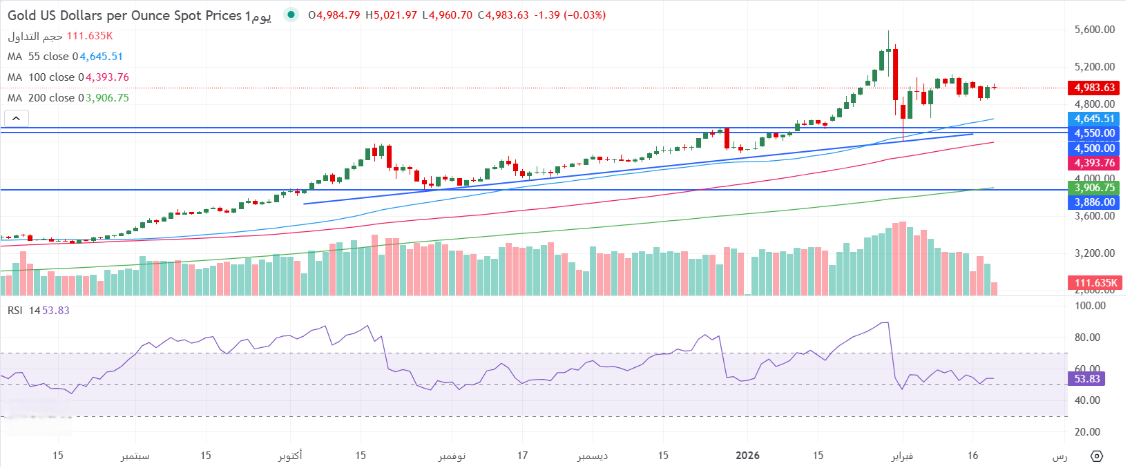 - على الرغم من التقلبات الشديدة في أسعار الذهب في الأسواق العالمية حتى الآن، يحافظ المعدن الأصفر على الاتجاه الصاعد الرئيسي ويتداول فوق جميع المتوسطات المتحركة اليومية الرئيسية عند محيط منطقة 4983 دولار للأونصة، في وقت كتابة هذا التقرير.