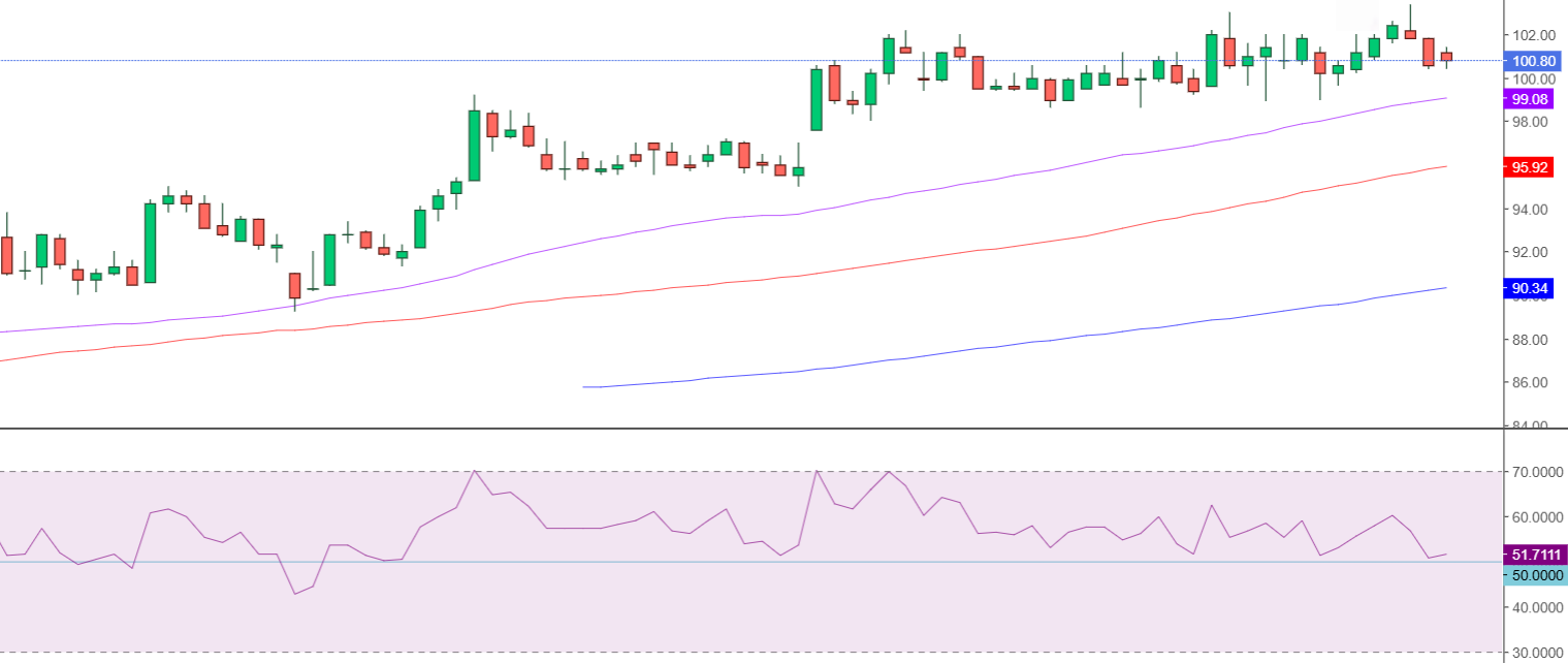 يتراجع سعر سهم مصرف الراجحي اليوم مقارنة بسعر الافتتاح خلال تداولات يوم الخميس 20 مارس/آذار 2025، حيث يتداول عند منطقة 100.60، منخفضاً بنسبة 0.79% خلال اليوم. سجل السهم أعلى مستوياته خلال ما يقرب من عامين ونصف العام عند منطقة 103.40 منذ يومين، قبل أن ينخفض بعد ذلك. افتتح سهم مصرف الراجحي التداولات اليوم عند منطقة 101.20، أعلى من مستويات إغلاق جلسة يوم أمس عند منطقة 100.60، ولكنه تراجع بعد ذلك خلال اليوم. سجل السهم أدنى مستوياته خلال اليوم عند منطقة 100.40 وأعلى مستوياته خلال اليوم عند منطقة 101.40. يحوم مؤشر القوة النسبية بإعدادات 14 يوماً أعلى بقليل من مستويات 50 المحايدة، حيث لم يكسر المؤشر المستويات المحايدة نحو الاتجاه الهابط منذ 19 ديسمبر/كانون الأول 2024، والتي في حالة كسرها سوف يتحول الزخم إلى هبوطي ويتم تحفيز عمليات بيع أقوى في السهم. في حالة عدم كسر مستويات 50 المحايدة، سوف يرتد السهم ليستأنف الاتجاه الصاعد. يستمر السهم في التداول فوق جميع المتوسطات المتحركة الرئيسية، مما يشير إلى عدم تلاشي الزخم الصعودي بشكل كامل حتى الآن، في وقت كتابة هذا التقرير.