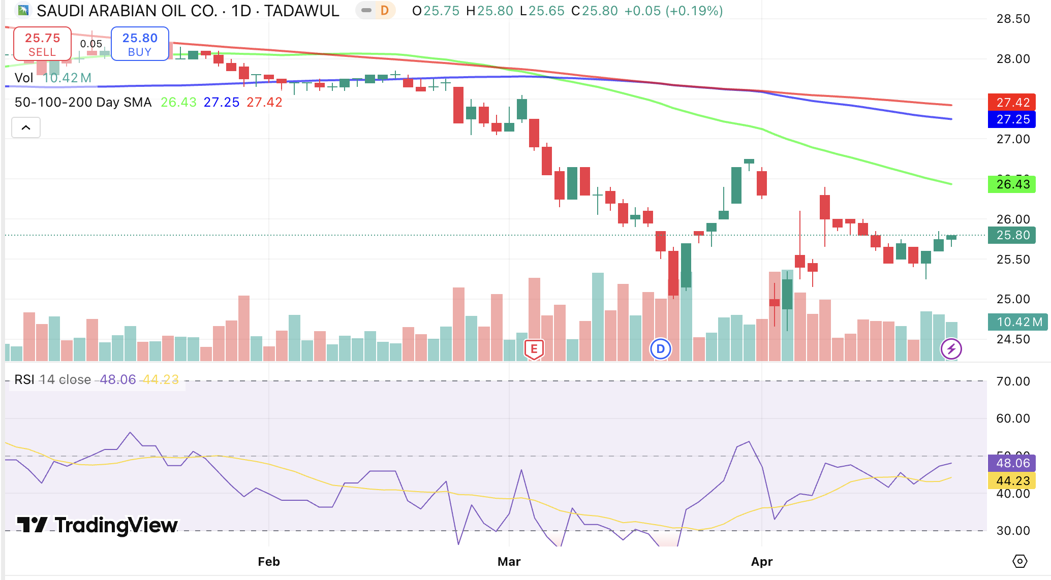 شهد سهم أرامكو تحركات سعرية متوازنة خلال الجلسات الثلاث الماضية، حيث أغلق يوم 21 أبريل عند مستوى 25.45 ريال منخفضًا بنسبة 0.97%، ثم ارتفع تدريجيًا بنسبة 0.59% في كل من يومي 22 و23 أبريل ليغلق عند 25.75 ريال. هذا التعافي التدريجي عقب التراجع يشير إلى احتمال تشكّل قاعدة سعرية تمهيدًا لحركة صعودية، مدعومة بإيجابية تقاطع خطي مؤشر الماكد (MACD) واستقرار مؤشر القوة النسبية (RSI) عند مستوى 48، وهو ما يعكس حالة حيادية.