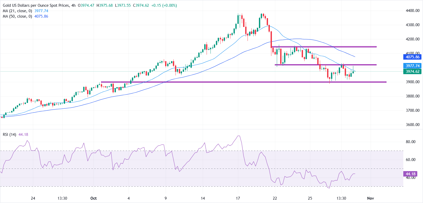 على الجانب الهبوطي، يعمل مستوى 3900 دولار كدعم قوي، حيث ظهرت رغبة في الشراء عند الانخفاضات في الجلسات الأخيرة. يمكن أن يشير الاختراق دون هذا المستوى إلى استمرار المرحلة التصحيحية الأوسع. يحتفظ مؤشر القوة النسبية (RSI) بالقرب من 44، مما يشير إلى زخم صعودي معتدل مع قوة صعودية محدودة.