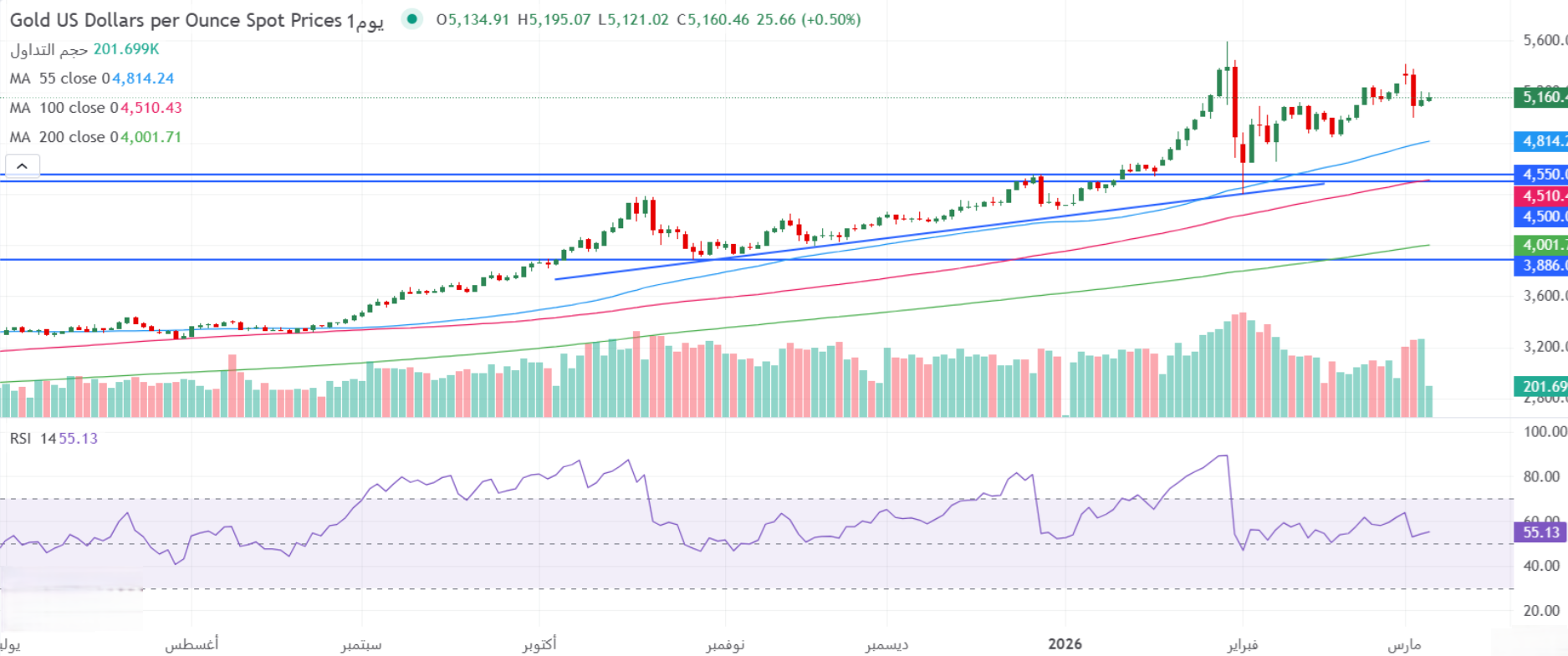 - على الرغم من التقلبات الشديدة في أسعار الذهب في الأسواق العالمية حتى الآن، يحافظ المعدن الأصفر على الاتجاه الصاعد الرئيسي ويتداول فوق جميع المتوسطات المتحركة اليومية الرئيسية الصاعدة، حيث يمدد ارتداد يوم أمس إلى محيط منطقة 5160 دولار للأونصة، في وقت كتابة هذا التقرير.