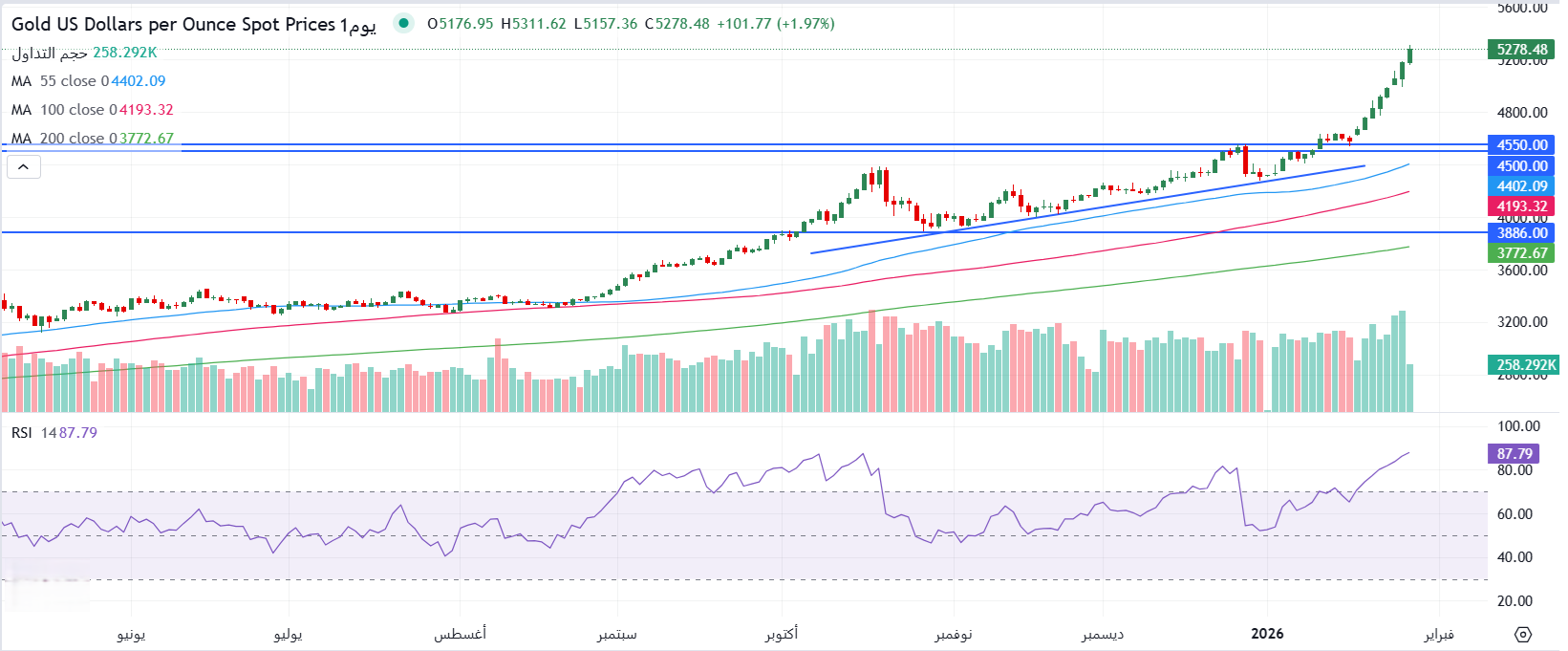 يستقر الذهب عند قمم قياسية جديدة فوق منطقة 5200 دولار، حيث قد يتزامن اختيار ترامب لرئيس البنك الاحتياطي الفيدرالي Fed مع صدور إعلانات السياسة النقدية. يشهد الدولار الأمريكي ارتفاعًا مدفوعاً من تغطية مراكز البيع المكشوفة بعد الانخفاض إلى أدنى مستوياته خلال أربع سنوات وقبل مخاطر الحدث الرئيسي للبنك الاحتياطي الفيدرالي Fed.