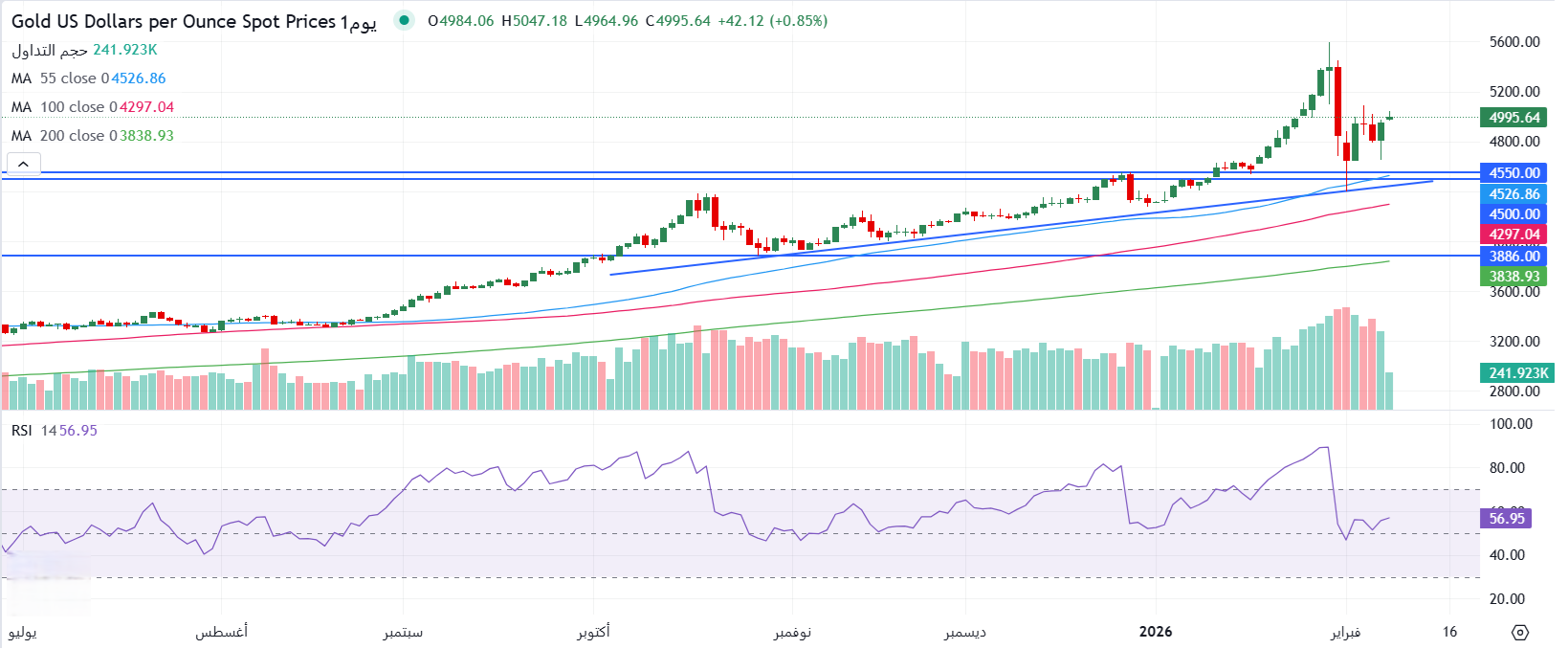 - يحاول الذهب في الأسواق العالمية اليوم الصمود فوق حاجز منطقة 5000 دولار للأونصة واختراق منطقة المقاومة 5092 (أعلى مستويات 4 فبراير/شباط) من أجل اكتساب الزخم وإعادة تحدي أعلى المستويات على الإطلاق عند محيط منطقة 5598 دولار للاونصة.