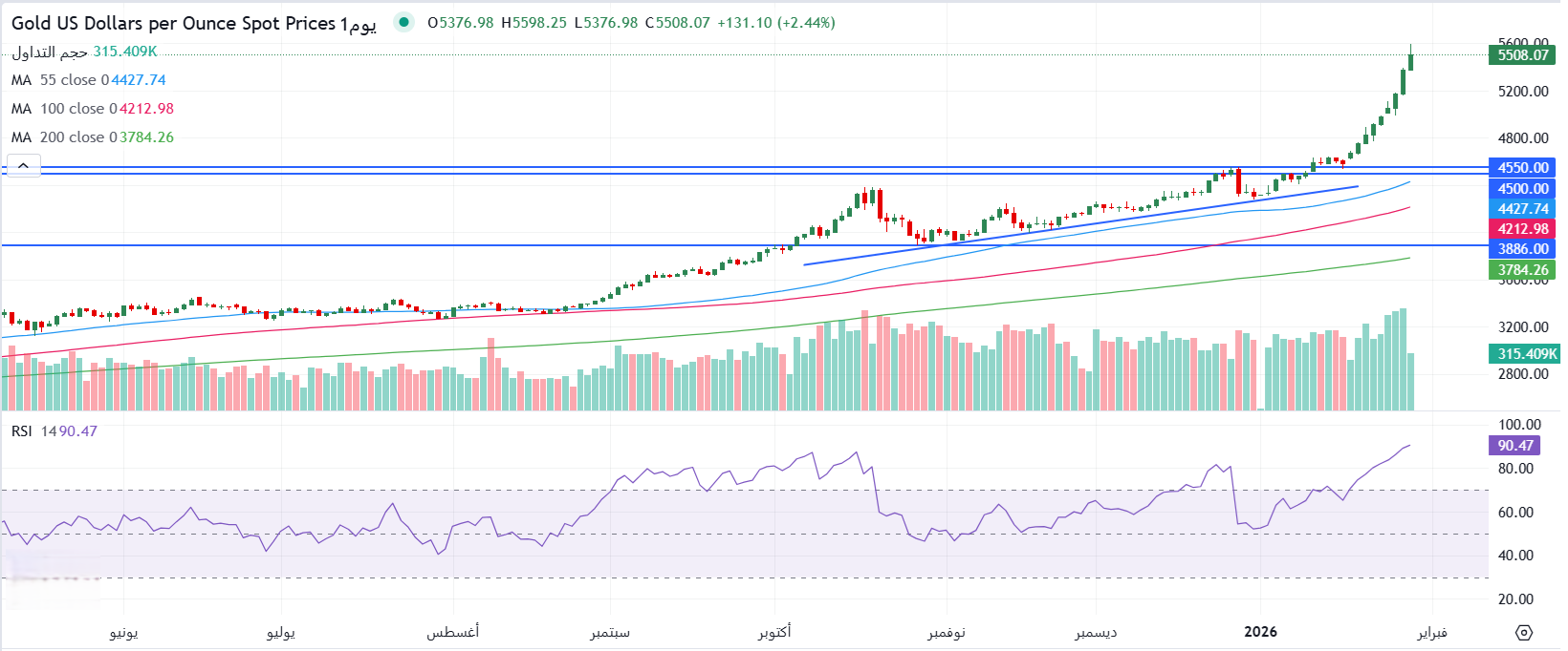 - تواصل أسعار الذهب الارتفاع في الأسواق العالمية بلا هوادة، مسجلة أعلى مستوياتها التاريخية على الإطلاق عند محيط منطقة 5598 دولار للأونصة في وقت سابق اليوم، حيث تتداول في الوقت الحالي عند محيط منطقة 5508 دولار للأونصة، في وقت كتابة هذا التقرير.