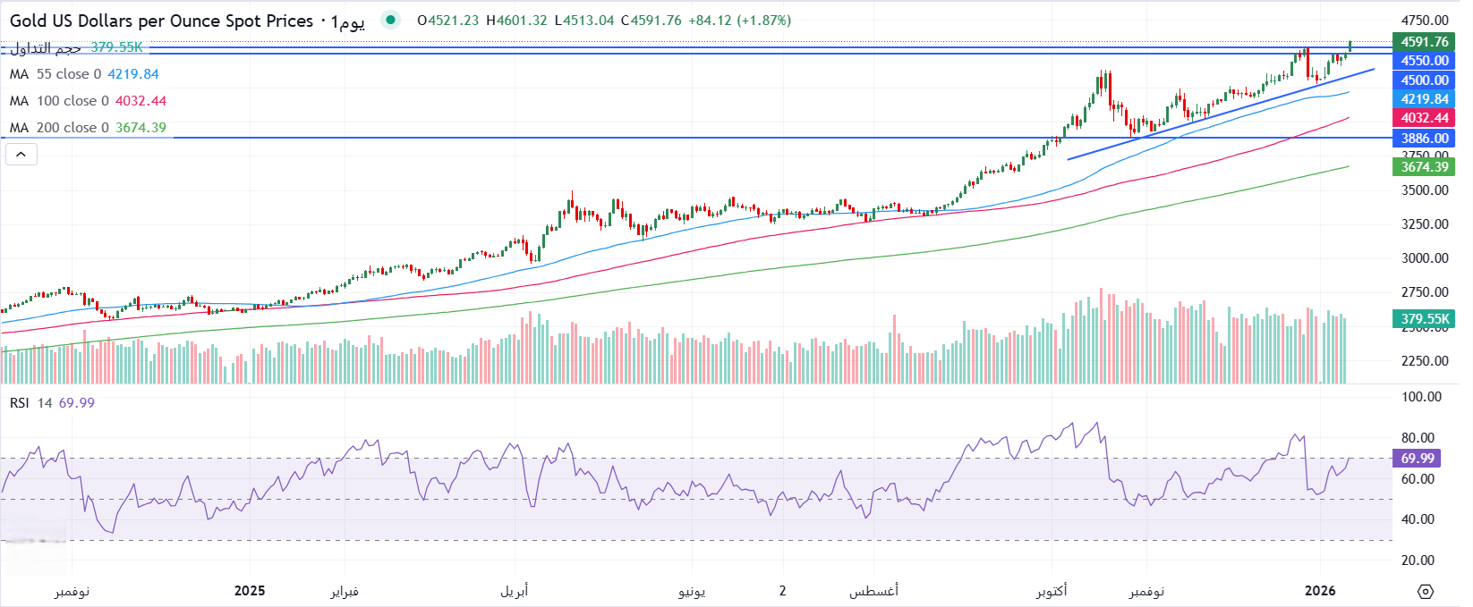 - يرتفع الذهب في الأسواق العالمية بقوة لليوم الثالث على التوالي، مسجلاً قمم قياسية جديدة خلال جلسة التداول الأوروبية يوم الإثنين عند محيط منطقة 4601 دولار للاونصة، متداولاً عند محيط منطقة 4592 دولار للأونصة في وقت كتابة هذا التقرير.