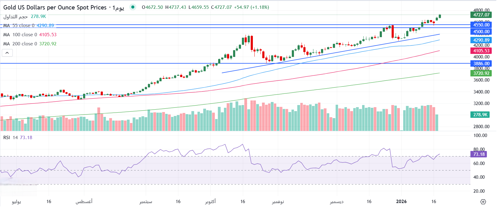 - تمدد أسعار الذهب الارتفاع القياسي في الأسواق العالمية إلى قمة قياسية جديدة عند محيط منطقة 4737 دولار للأونصة المسجلة في وقت سابق اليوم، لتتداول في الوقت الحالي عند محيط منطقة 4727 دولار للأونصة، في وقت كتابة هذا التقرير.