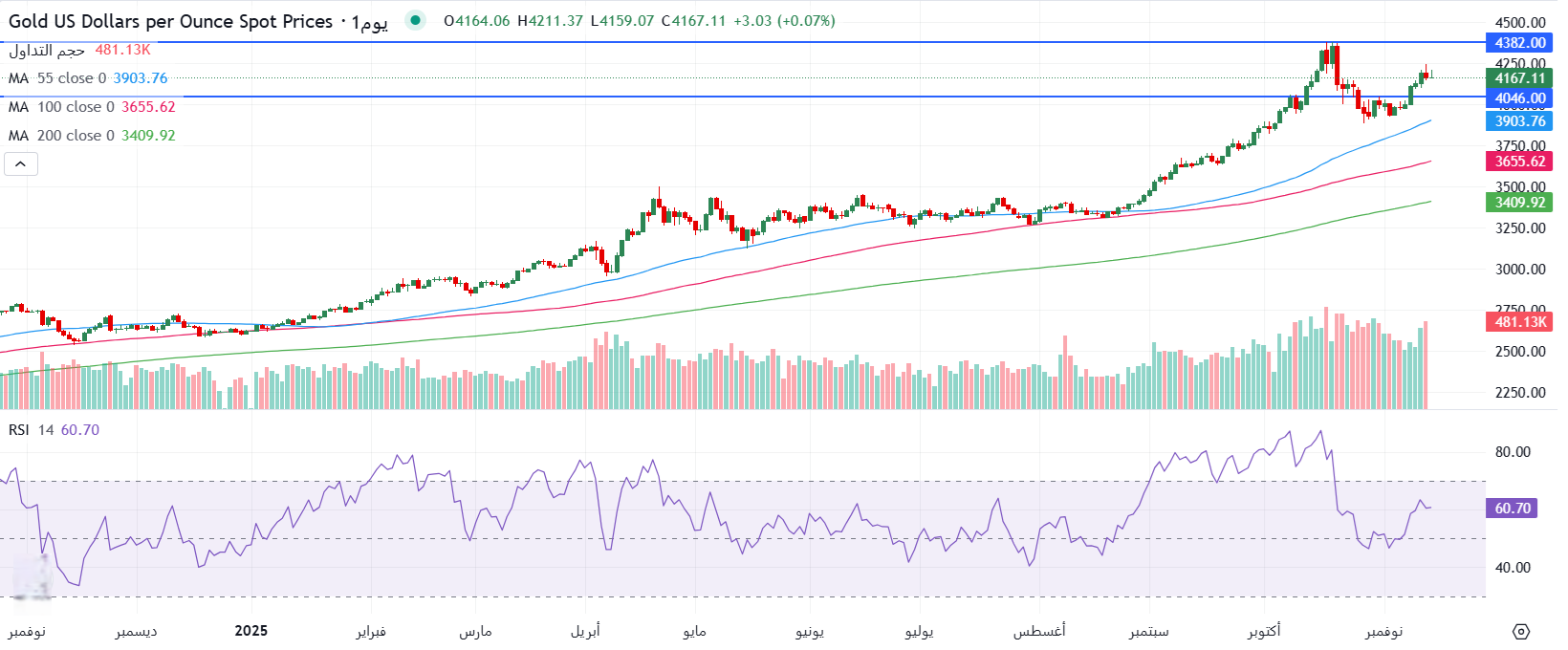 في الأسواق المحلية، تسجل أسعار الذهب انخفاضاً تصحيحياً بعد تسجيل خمس أيام متتالية من المكاسب في وقت مبكر من تداولات يوم الجمعة، حيث ينخفض عيار 21 الأكثر تداولاً في مصر إلى 5565 جنيه للبيع و 5515 جنيه للشراء، في وقت كتابة هذا التقرير، وذلك على خلفية مواجهة الارتفاع للرفض في الأسواق العالمية عند محيط منطقة 4245 دولار للأونصة المسجلة يوم أمس، حيث يتداول حول منطقة 4163 دولار الأونصة، في وقت كتابة هذا التقرير، وذلك على خلفية تقلص رهانات خفض معدلات الفائدة من جانب البنك الاحتياطي الفيدرالي Fed في ديسمبر/كانون الأول بعد إعادة تشغيل الحكومة الأمريكية، مما يصب في صالح الدولار الأمريكي ويضغط على المعدن الأصفر المقوم بالدولار الأمريكي.