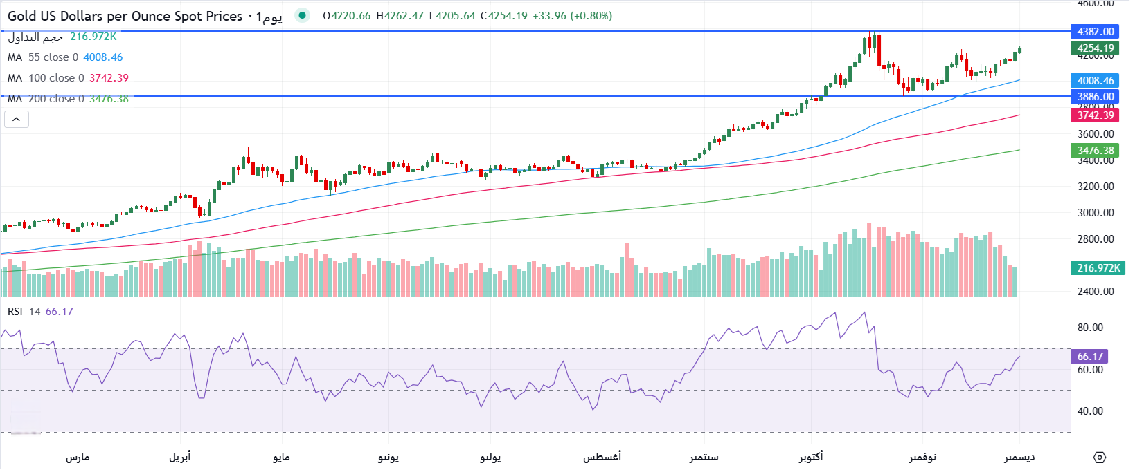 هذا المناخ الداعم ساعد أونصة الذهب على الصمود فوق حاجز منطقة 4200 دولار للأونصة، مما يشير إلى استمرار الزخم الصعودي حتى إعلان قرارات البنك الاحتياطي الفيدرالي Fed في الاجتماع المرتقب.