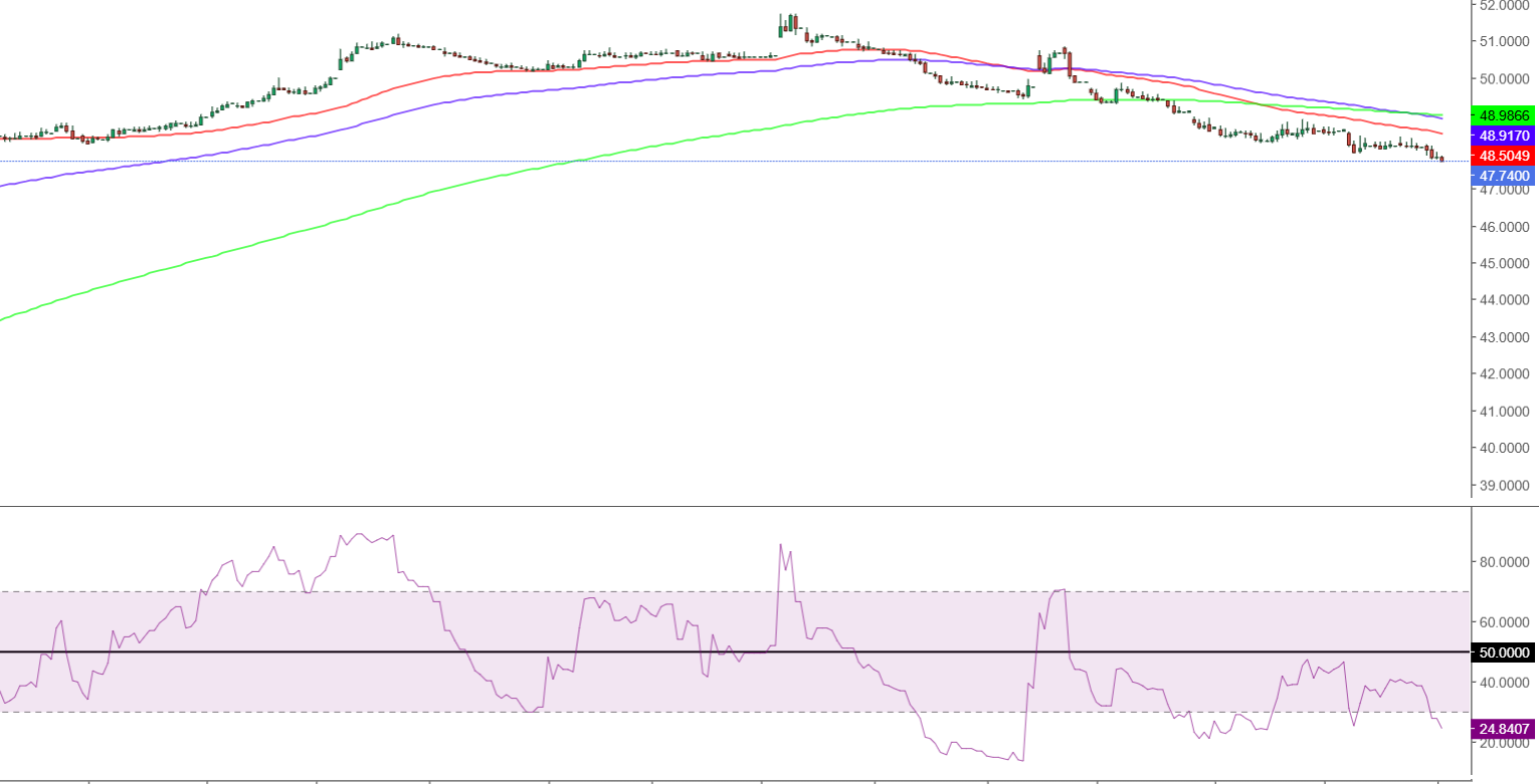 - يتحرك مؤشر القوة النسبية RSI بإعدادات 14 يوماً ضمن مناطق تشبع بيعي لليوم الثالث على التوالي، حيث يتحرك حول مستويات 26 في وقت كتابة هذا التقرير.
