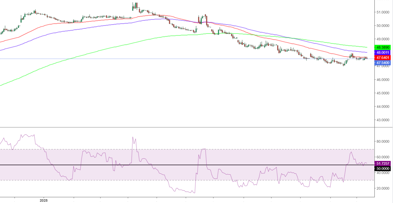 - يتم تداول زوج دولار أمريكي/جنيه مصري USD/EGP بشكل عرضي مستقر عند محيط منطقة 47.57، دون تغيير يُذكر مقارنة بأسعار إغلاق يوم أمس، في وقت كتابة هذا التقرير.