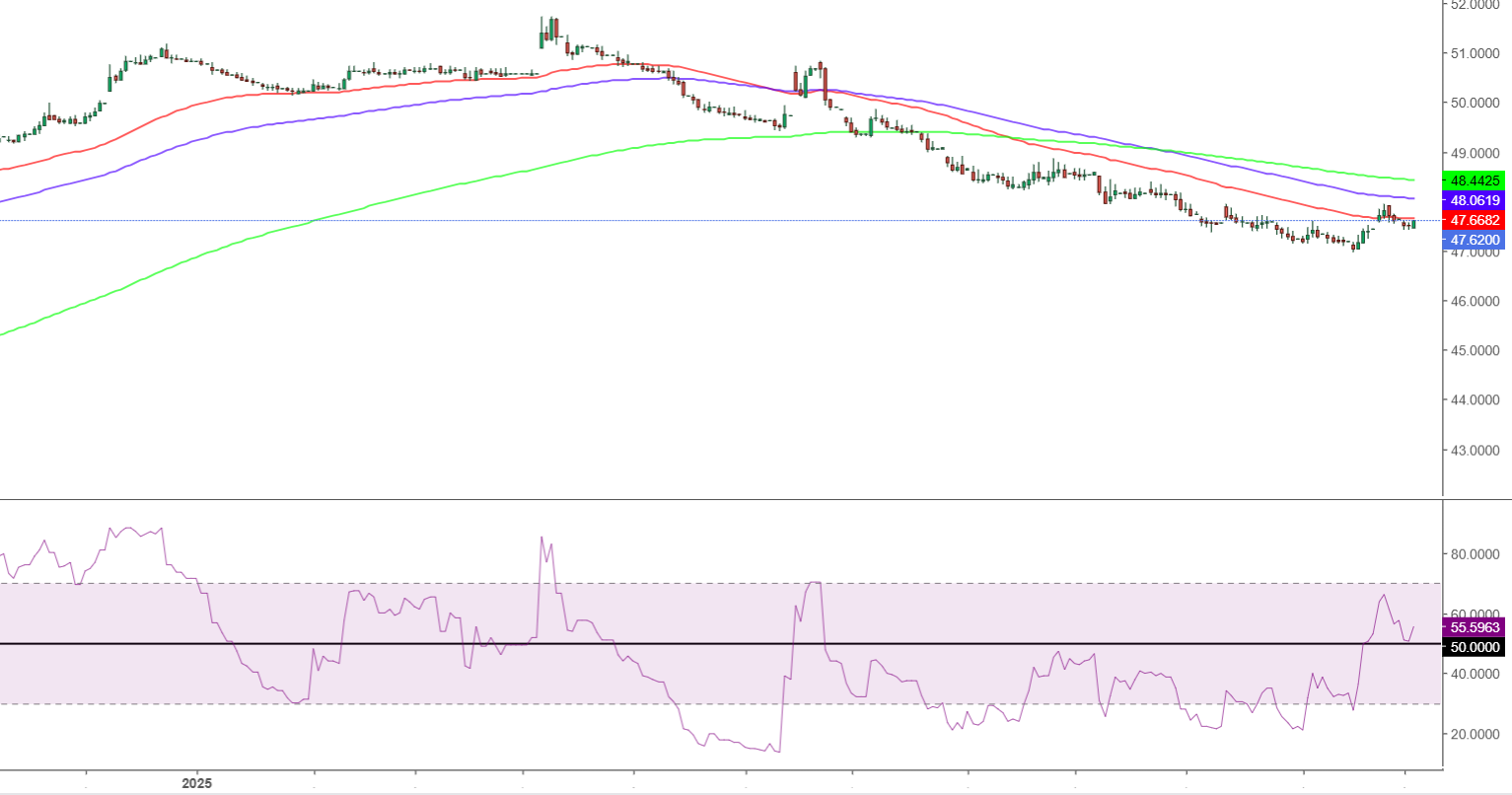 - يصمد مؤشر القوة النسبية RSI بإعدادات 14 يوماً حول خط المنتصف 50، حيث يُظهر تردد المتداولين حول مستويات 50 في وقت كتابة هذا التقرير.