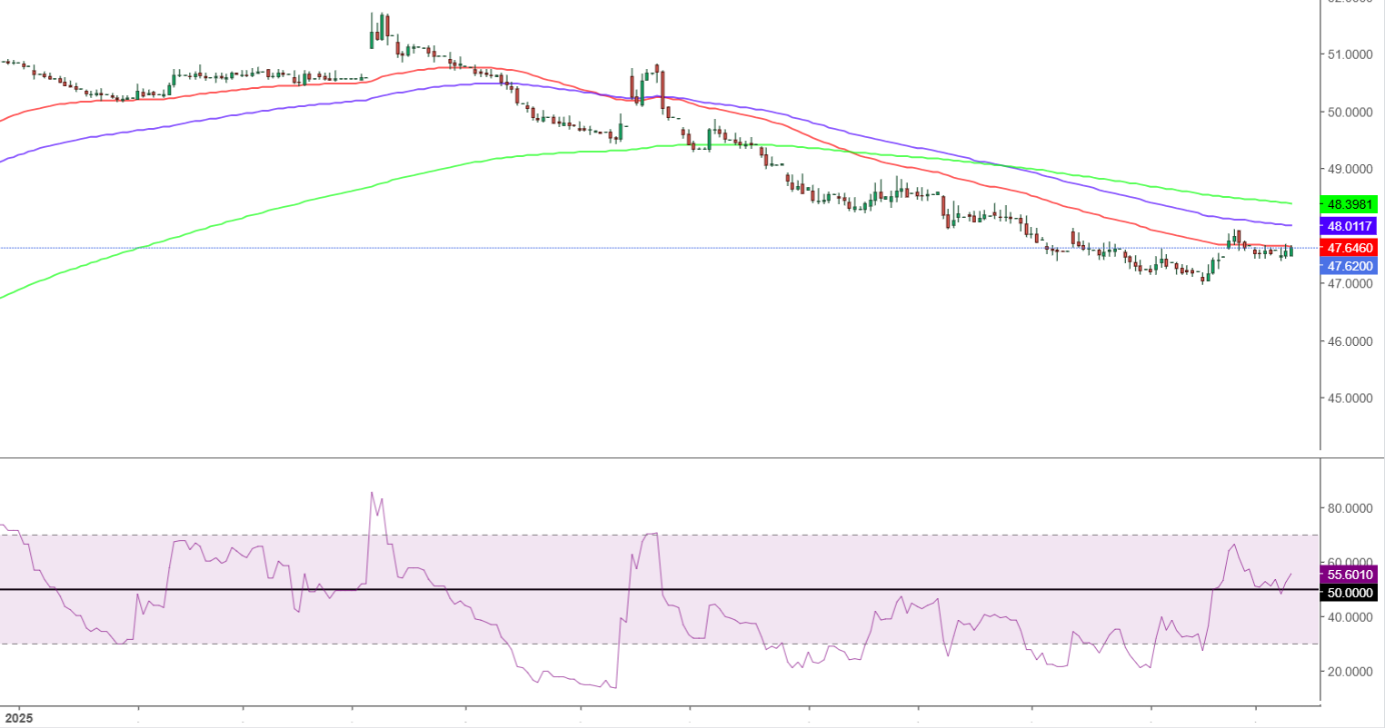 البنك الأهلي المصري: 47.55 جنيه للشراء، 47.65 جنيه للبيع.