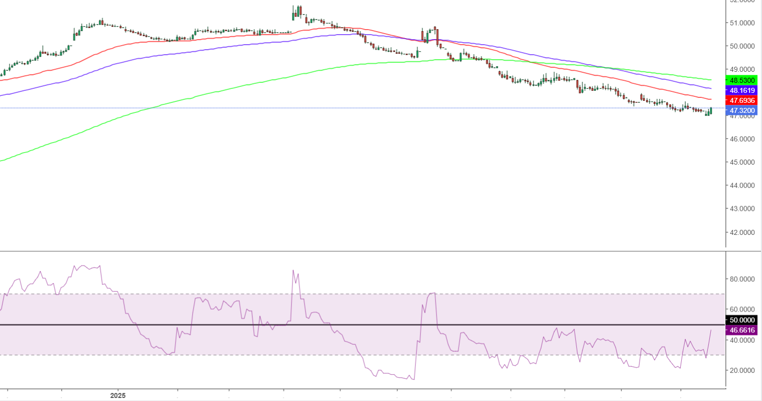 - يمدد مؤشر القوة النسبية RSI بإعدادات 14 يوماً الارتداد بقوة، مقترباً من خط المنتصف حول مستويات 48 في وقت كتابة هذا التقرير.