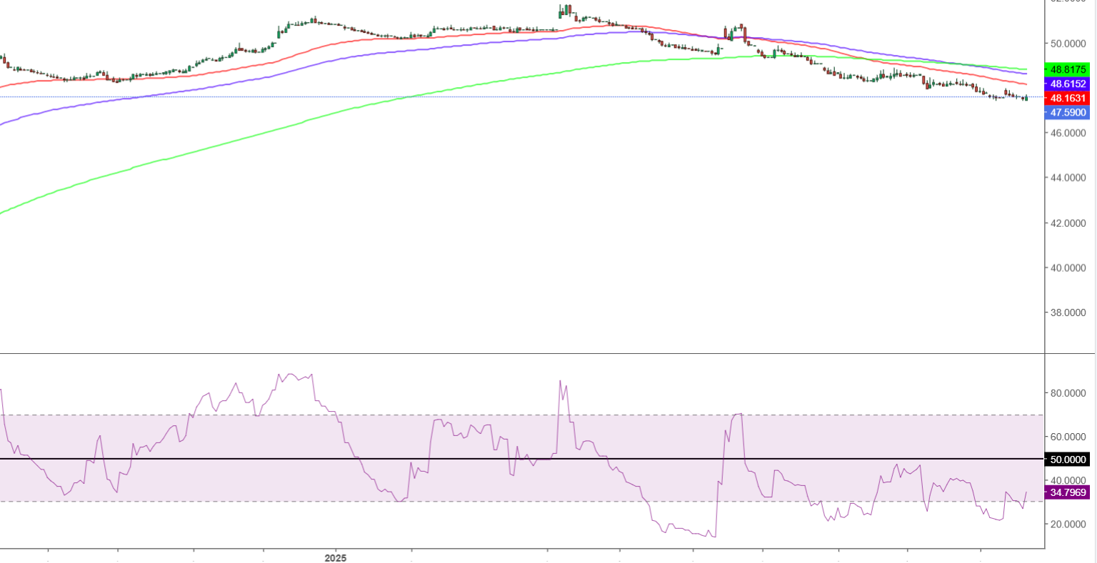 - يرتد مؤشر القوة النسبية RSI بإعدادات 14 يوماً من مناطق التشبع البيعي، حيث يتحرك حول مستويات 33 في وقت كتابة هذا التقرير.