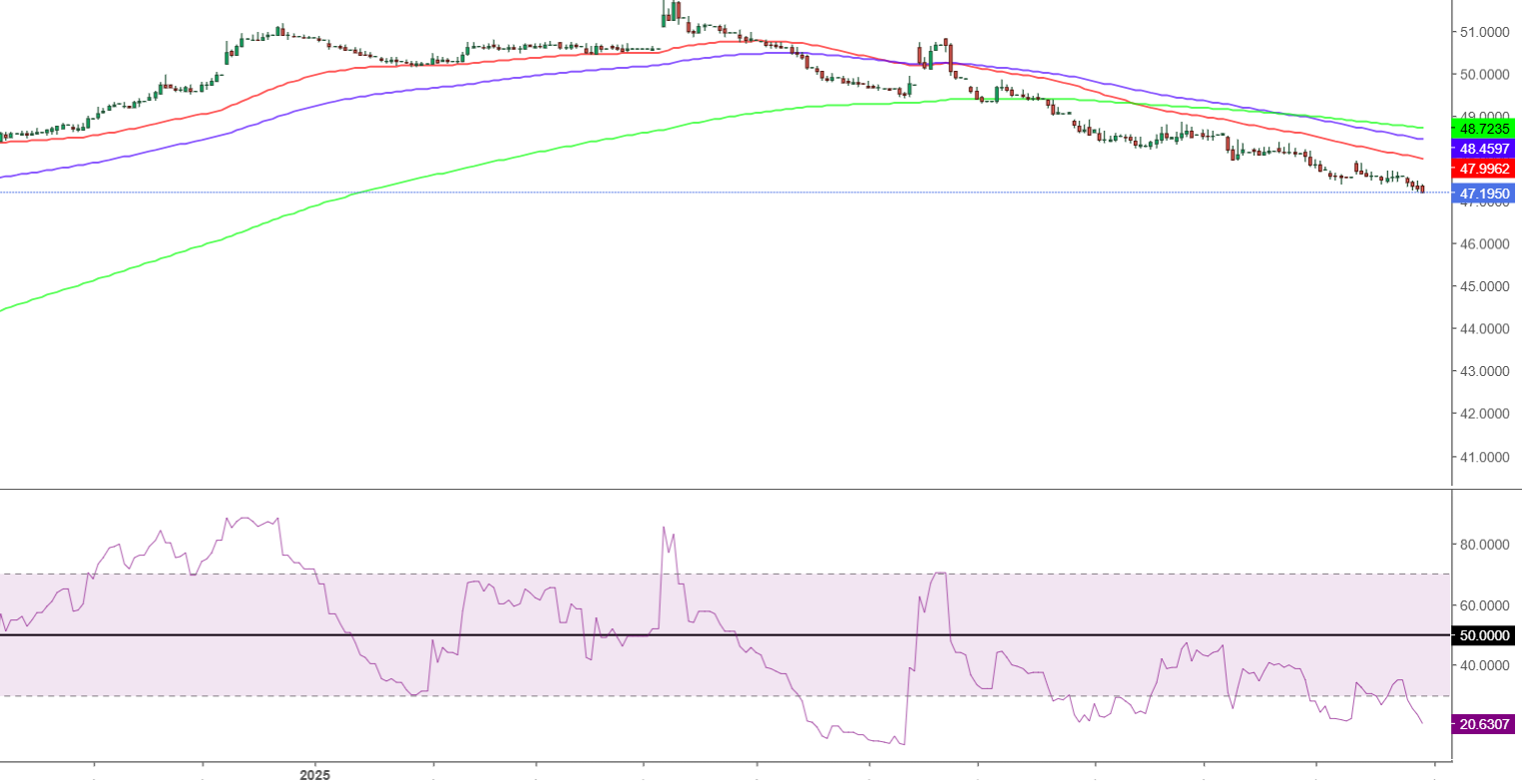 - يمدد مؤشر القوة النسبية RSI بإعدادات 14 يوماً الانخفاض ضمن مناطق تشبع بيعي، حيث يتحرك حول مستويات 21 في وقت كتابة هذا التقرير.