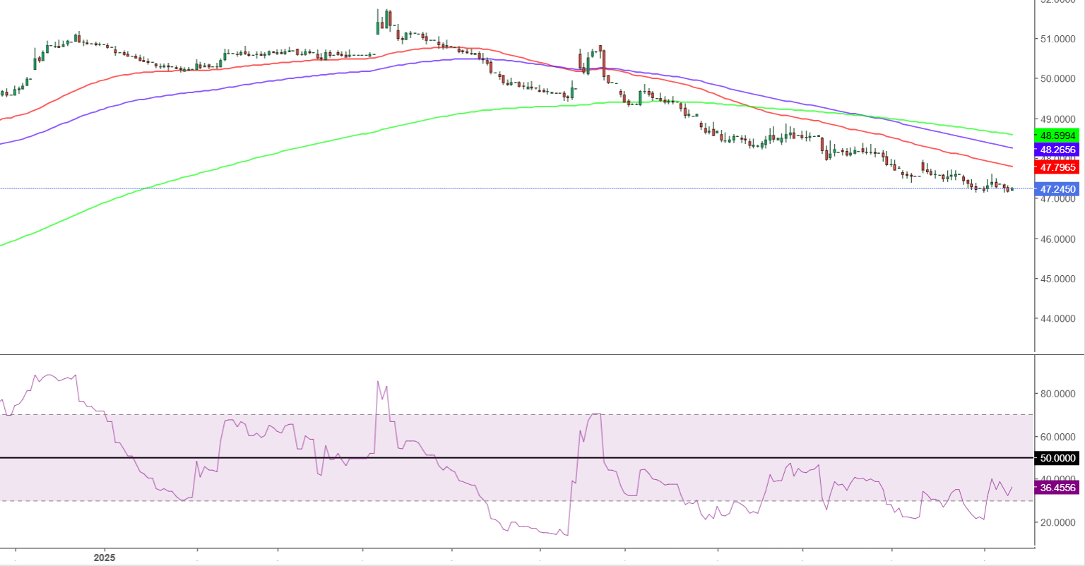 بنك كريدي أجريكول: 47.15 جنيه للشراء، 47.25 جنيه للبيع.