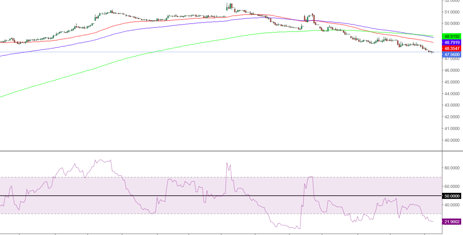 - يستمر مؤشر القوة النسبية RSI بإعدادات 14 يوماً في التحرك ضمن مناطق تشبع بيعي مفرطة، حيث يتحرك حول مستويات 22 في وقت كتابة هذا التقرير.