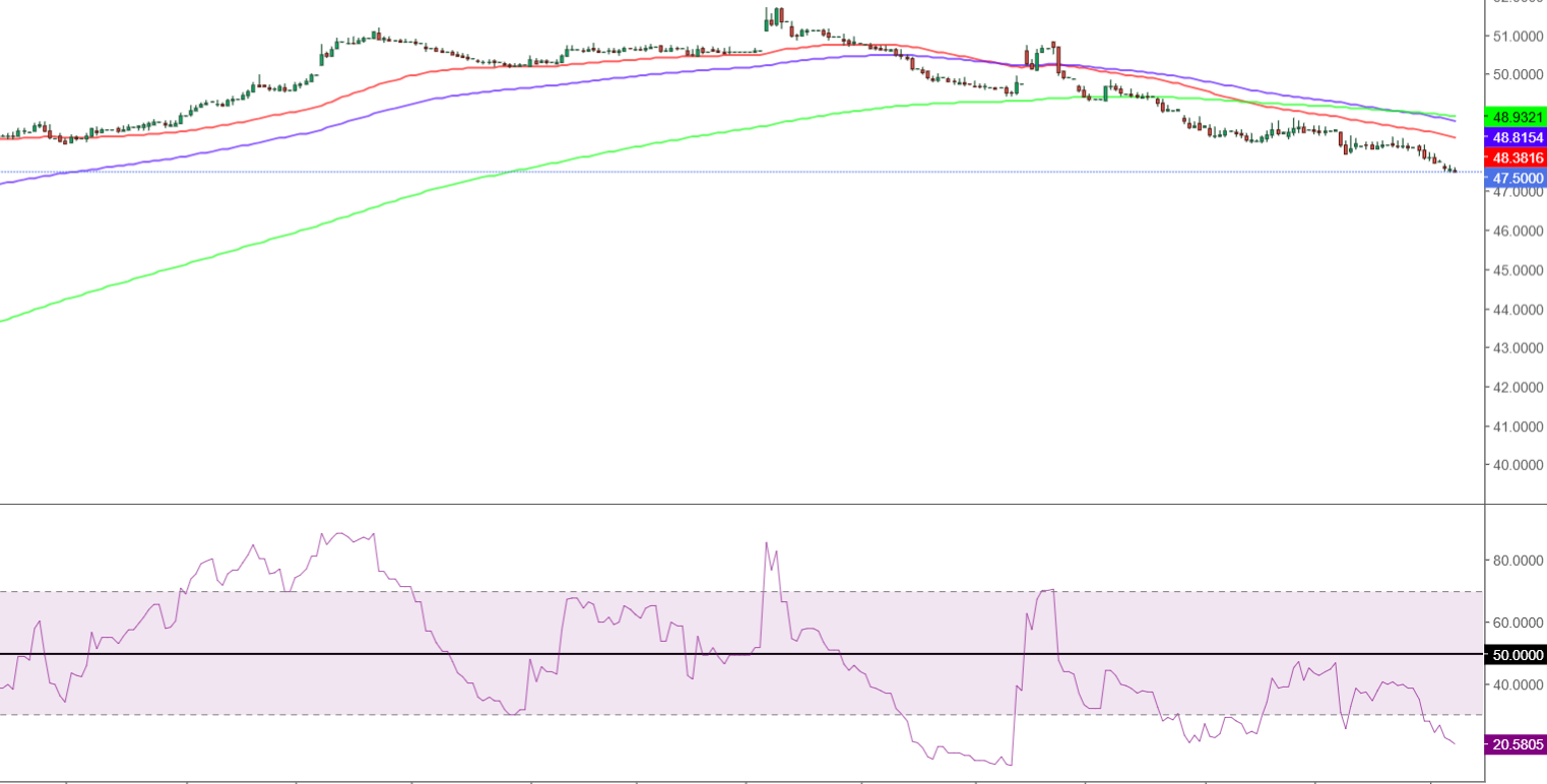 - يستمر مؤشر القوة النسبية RSI بإعدادات 14 يوماً في التحرك ضمن مناطق تشبع بيعي مفرطة، حيث يتحرك حول مستويات 20 في وقت كتابة هذا التقرير.