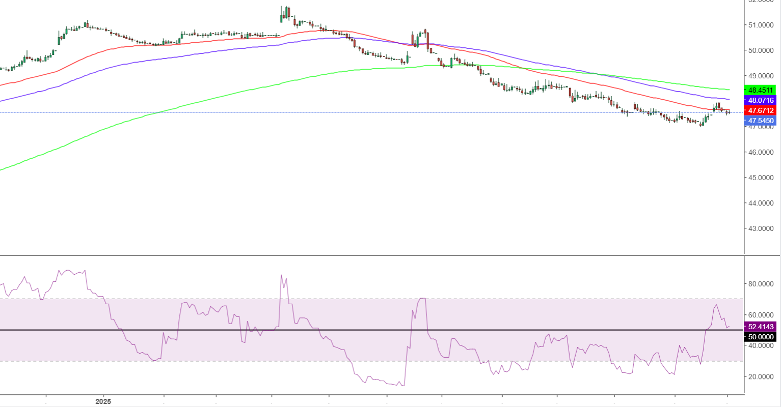 - يستقر مؤشر القوة النسبية RSI بإعدادات 14 يوماً عند محيط خط المنتصف 50، حيث يُظهر موقفاً محايداً حول مستويات 50 في وقت كتابة هذا التقرير.