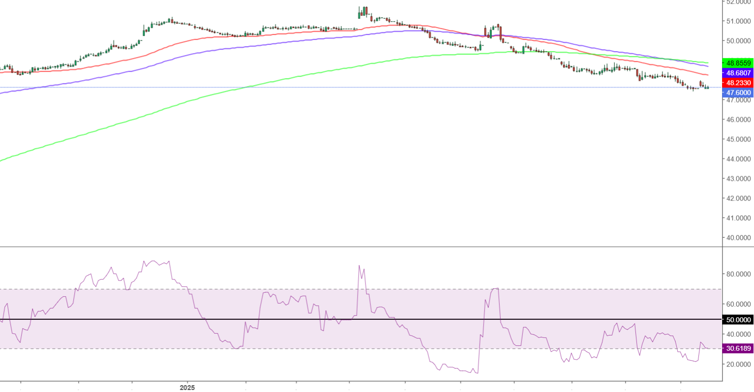 - يداعب مؤشر القوة النسبية RSI بإعدادات 14 يوماً مناطق التشبع البيعي، حيث يتحرك حول مستويات 30 في وقت كتابة هذا التقرير.