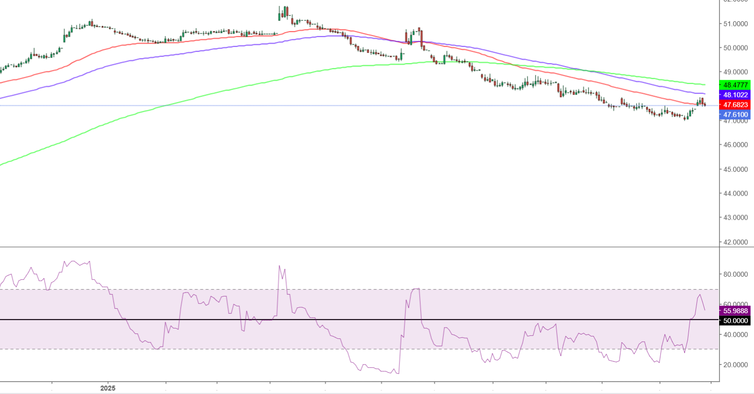 البنك الأهلي المصري: 47.61 جنيه للشراء، 47.71 جنيه للبيع.