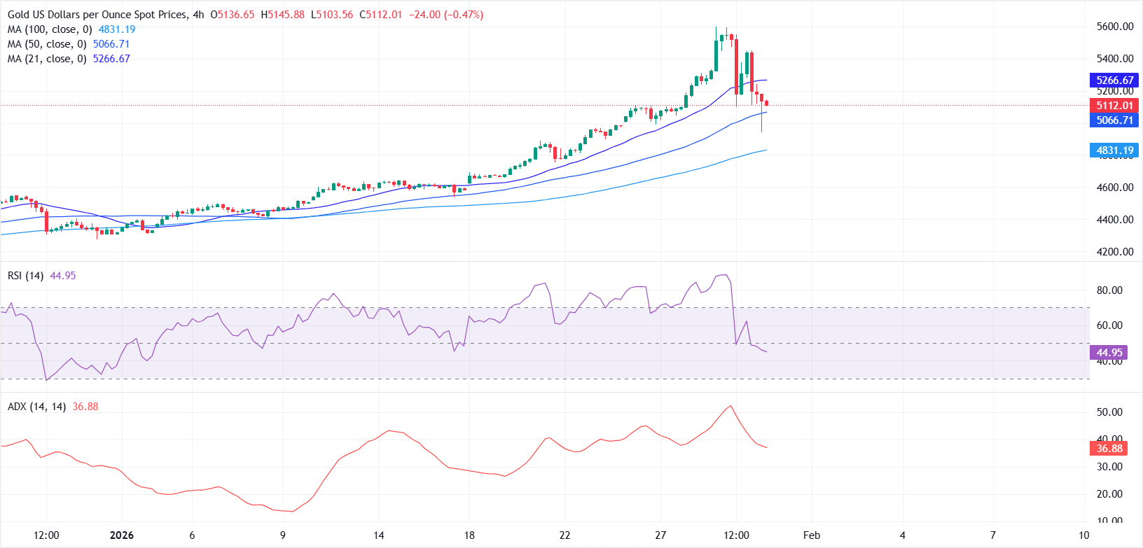 تعرض الذهب (XAU/USD) لضغوط بيع شديدة يوم الجمعة، متراجعًا عن معظم المكاسب التي حققها في وقت سابق من هذا الأسبوع، حيث أدى التقلب الشديد إلى تصفية واسعة النطاق للمراكز ذات الرافعة المالية. في الوقت نفسه، قام المتداولون بجني الأرباح عند مستويات الأسعار المرتفعة. عند كتابة هذا التقرير، يتم تداول الذهب (XAU/USD) عند حوالي 5115 دولارًا أمريكيًا، بعد أن سجل أعلى مستوى له على الإطلاق قرب 5600 دولار أمريكي يوم الخميس.