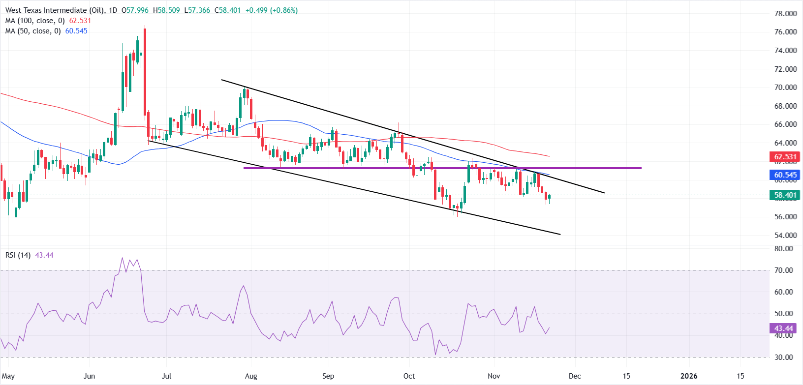 من الناحية الفنية، يبقى خام غرب تكساس الوسيط WTI محصورًا ضمن قناة هبوطية متوازية محددة جيدًا على الرسم البياني اليومي، تتميز بتسلسل من القمم والقيعان المنخفضة، مما يحافظ على النظرة العامة نحو الانخفاض. تستمر الأسعار في التداول دون كل من المتوسطات المتحركة البسيطة لمدة 50 يومًا و100 يوم، مما يعزز الميل الهيكلي الهبوطي.